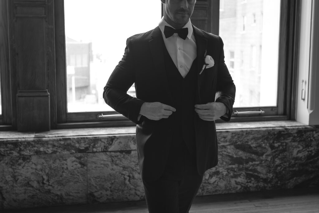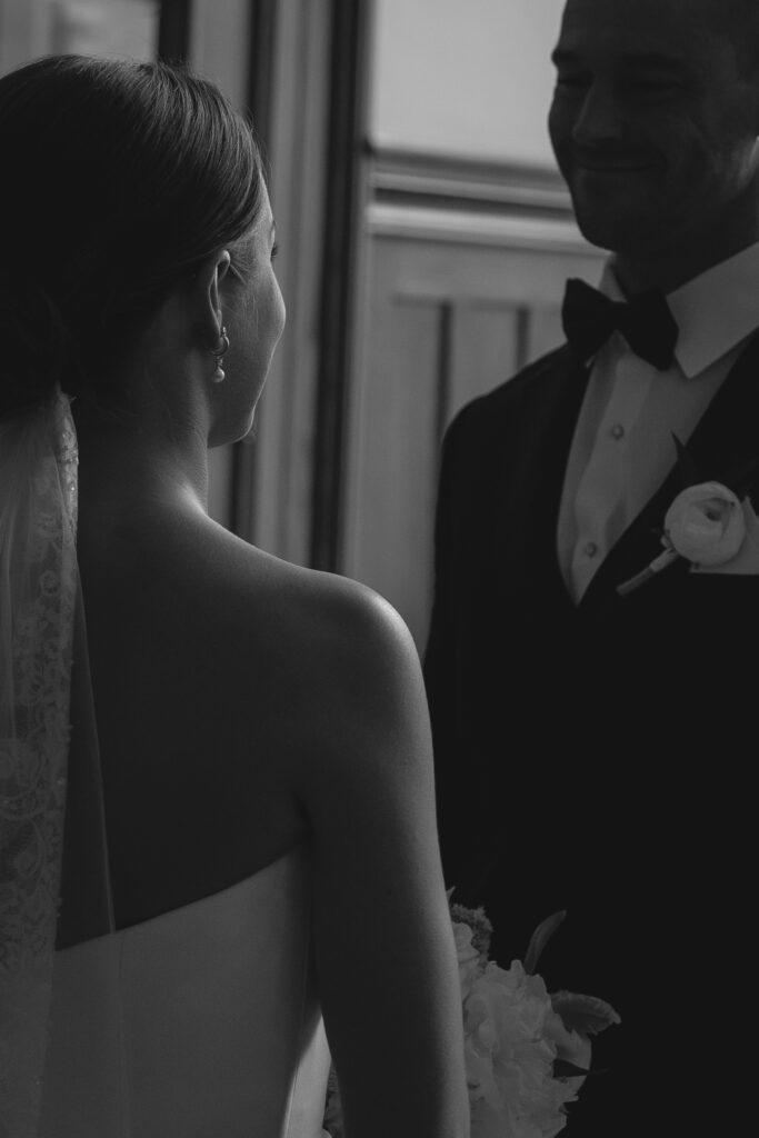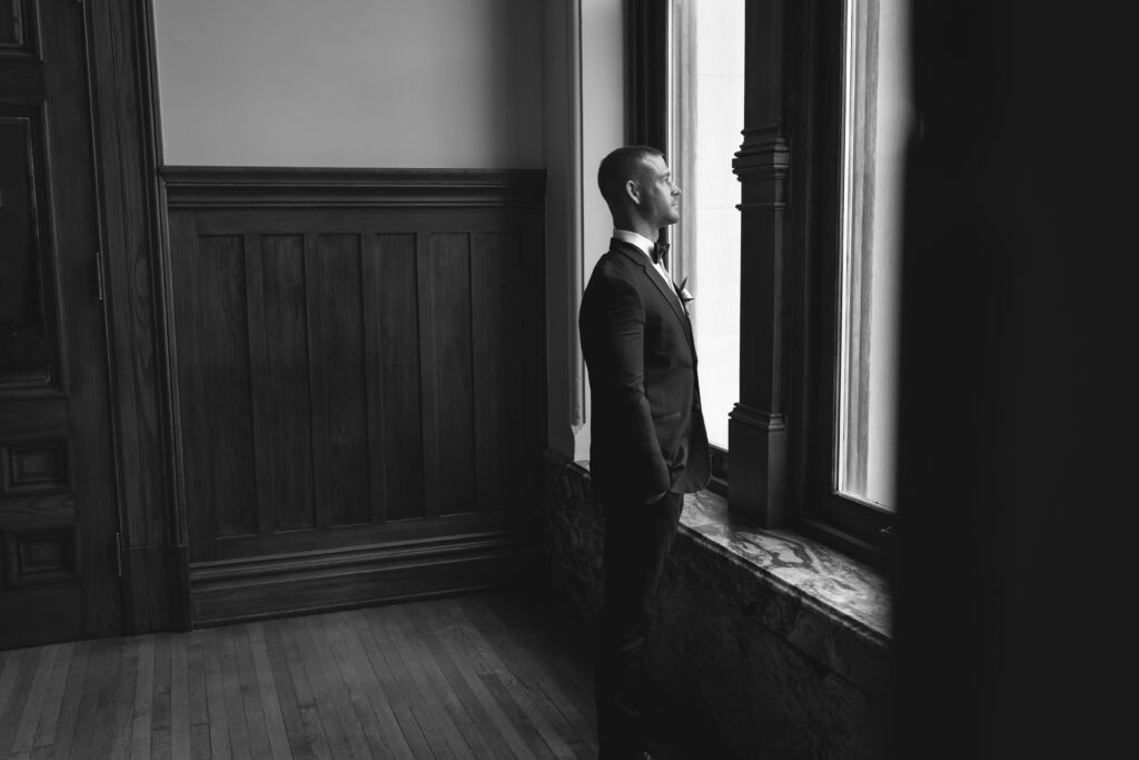 We started the day with individual portraits so Jayda and Ryan could settle in before seeing each other. After that, they shared a first look in front of the large windows just off the ballroom. The light in that space was so good — soft, bright, and incredibly flattering.
